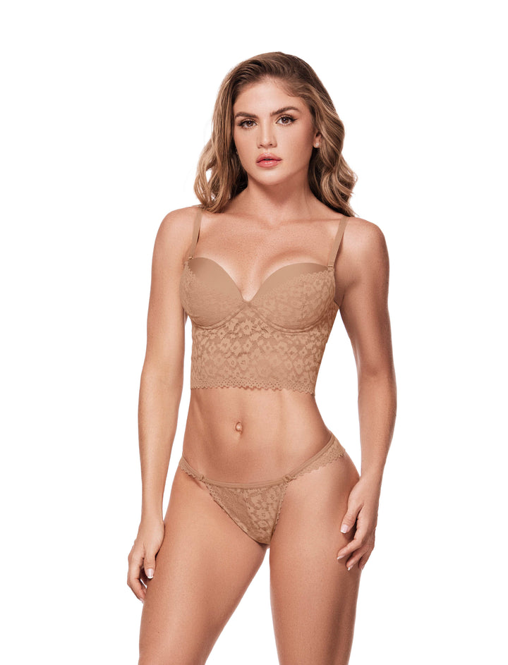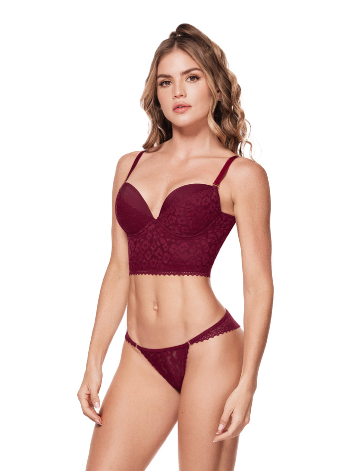 Este corpiño está cubierto totalmente en el más delicado de los encajes, cuenta con suaves copas en espuma y arcos que soportan tu busto. Su espalda ancha con control interno disimula los rollitos de esta zona dándoles una apariencia plana.