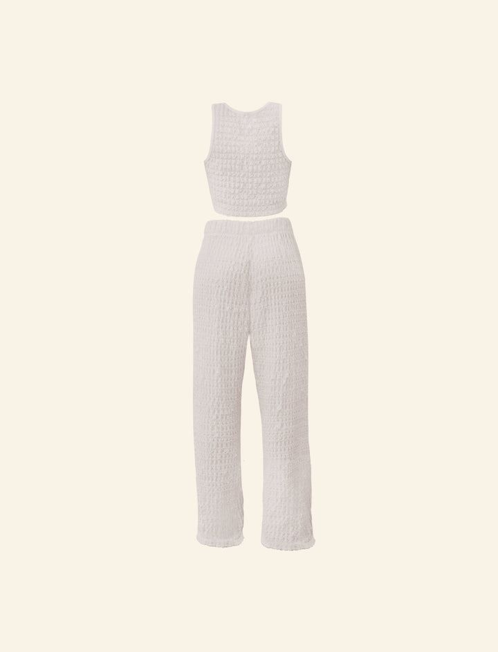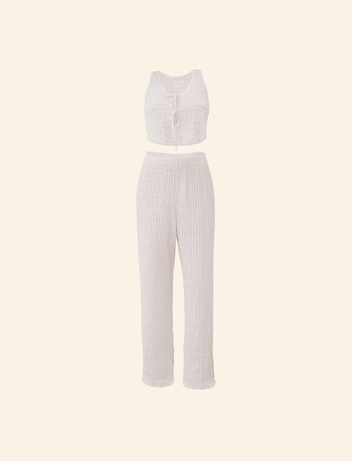 Set compuesto por un chaleco para anudar y un pantalón de silueta suelta, confeccionado en una tela ligera con diseño exclusivo. La caída fluida del tejido y el ajuste relajado brindan una sensación de frescura, ideal para climas cálidos o días de movimiento.