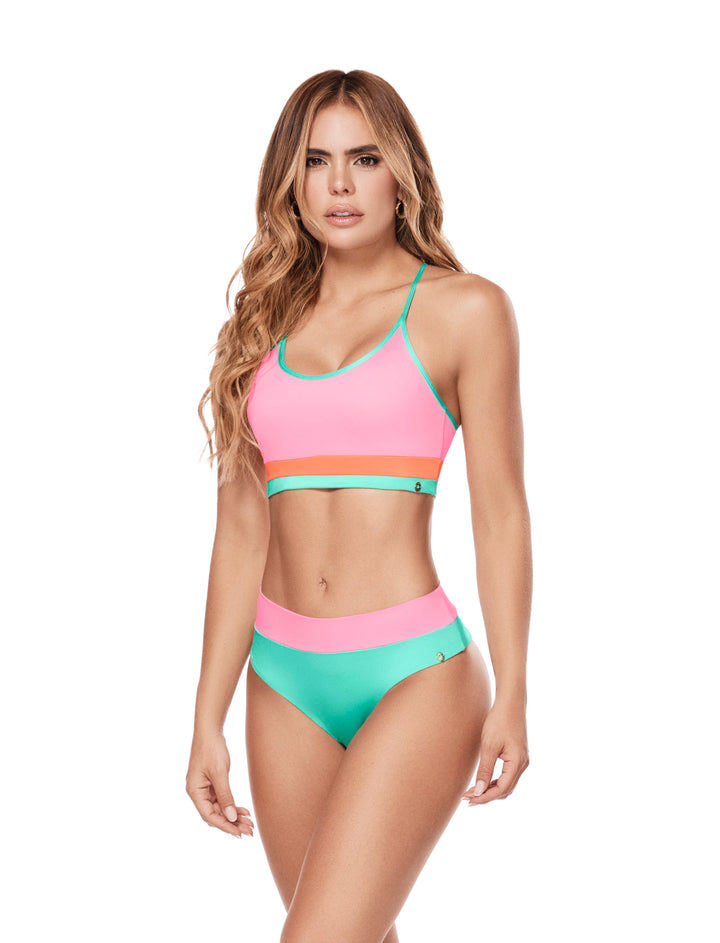 Un top de baño que combina perfectamente el color y la comodidad en un solo lugar. Las combinaciones de color y material con brillo sutil de este top de baño le dan un toque fresco y juvenil para esas mujeres que quieren sentirse cómodas ya la moda al mismo tiempo. Diseño en espalda con argolla.